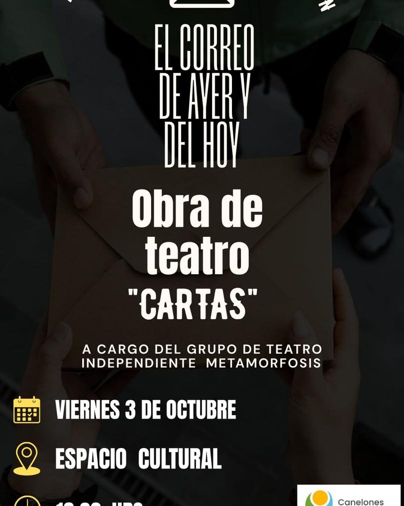 Obra de teatro en el Espacio Cultural EL CORREO DE AYER Y DEL HOY Obra de teatro "CARTAS" A CARGO DEL GRUPO DE TEATRO INDEPENDIENTE METAMORFOSIS VIERNES 3 DE OCTUBRE ESPACIO CULTURAL 18:30 HRS Galería de imágenes